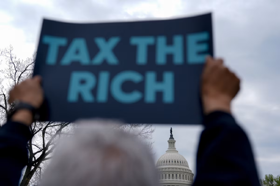 2025 年 4 月 10 日,华盛顿国会山附近一场抗议活动中,示威者举着 “向富人征税” 的标语。