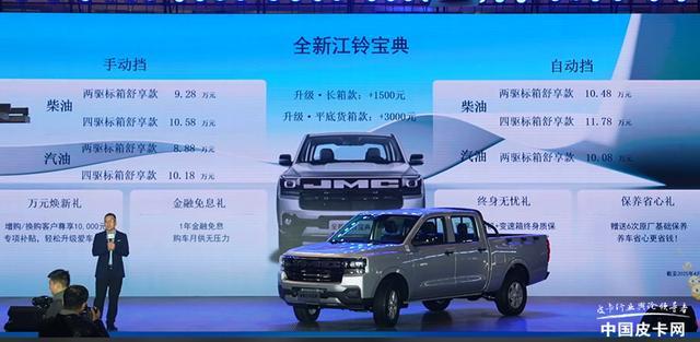 2025年3月18日,全新江铃宝典正式上市,售价区间8.88-11.78万元。新车外观向江铃大道看齐,提供标箱、长箱、平底货箱三种版本,货箱容积最大1.6立方米,750mm低货台设计提升装卸便利性。动力方面,搭载2.5T蓝焰柴油发动机,最大功率118kW,最大扭矩410N・m,同时还有2.0T汽油发动机可选,与发动机匹配手动与自动变速箱可选。