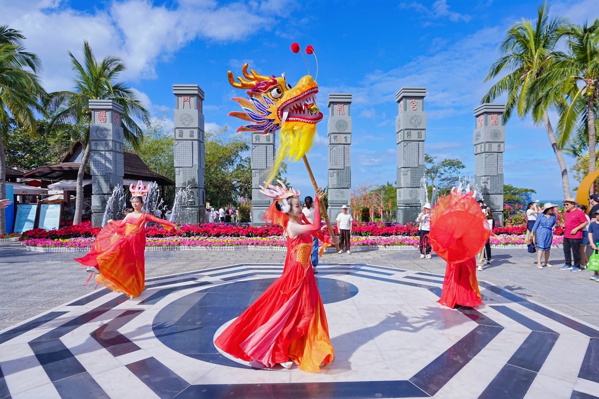为丰富游客体验,景区精心筹备了多场民俗演艺活动,在太极广场、椰林道等核心区域轮番上演。“龙吟九州”龙舞表演率先登场,身着盛装的舞者伴着铿锵鼓点腾跃翻转,金色龙身在阳光下熠熠生辉,灵动的姿态引得现场游客纷纷举起手机、相机,记录下这一精彩瞬间。随后,非遗滚灯民俗展演、椰林市集特色歌舞相继亮相,演员们与游客热情互动。“既能漫步海边、聆听涛声,又能观赏民俗、感受年味,这趟新春之旅收获满满。”驻足观看演出的广东游客李先生由衷赞叹。