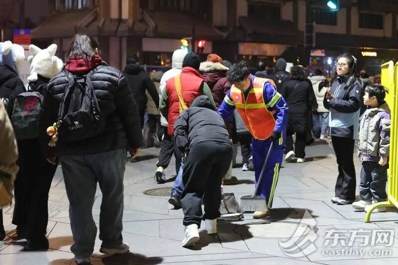 寒风中,他的脸被吹得有些发红,但手上的活儿没有停。身旁的祈福人群匆匆而过,很少有人注意到低头忙碌的环卫工人。但正是他们,让这场上海的新年有了整洁的环境。