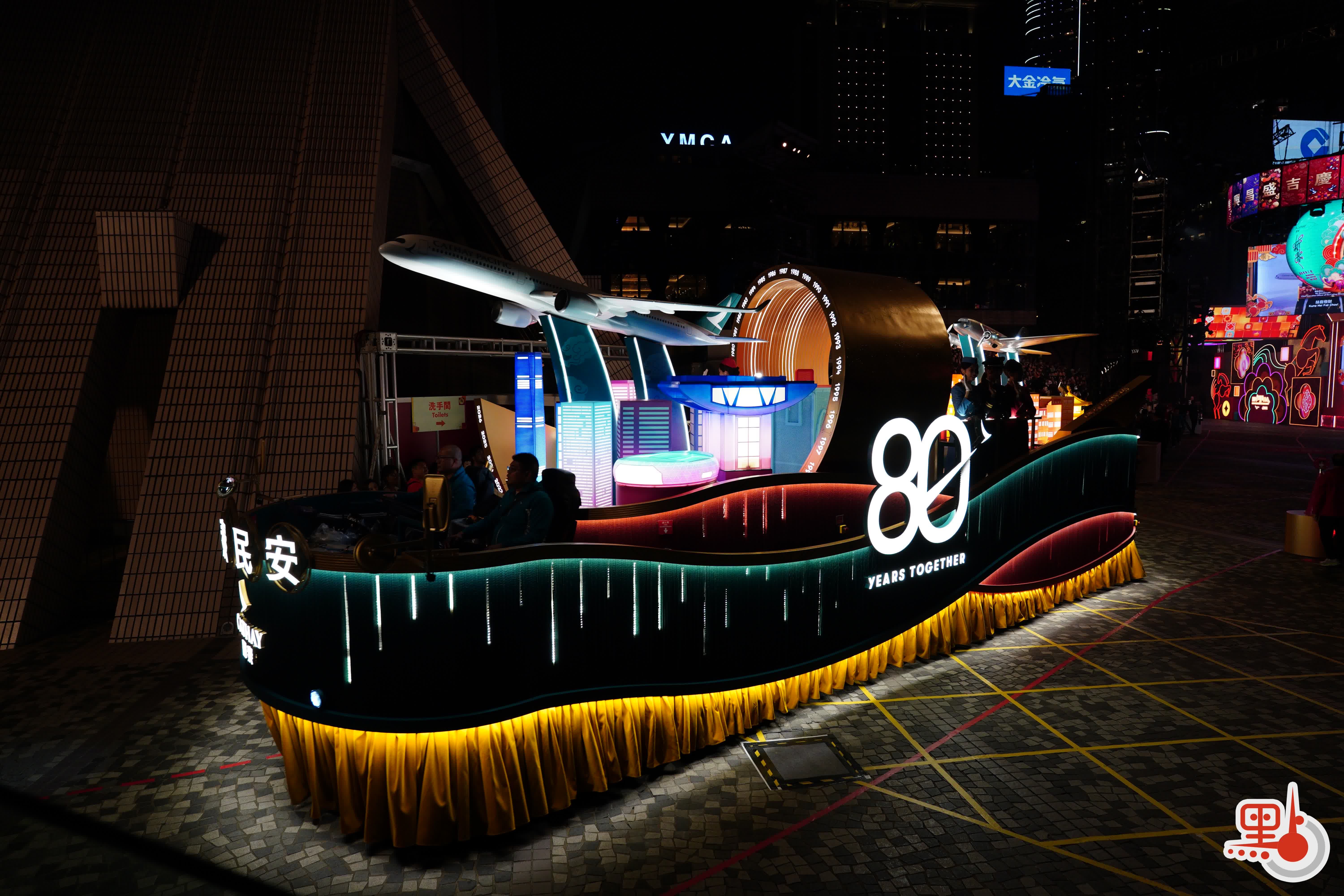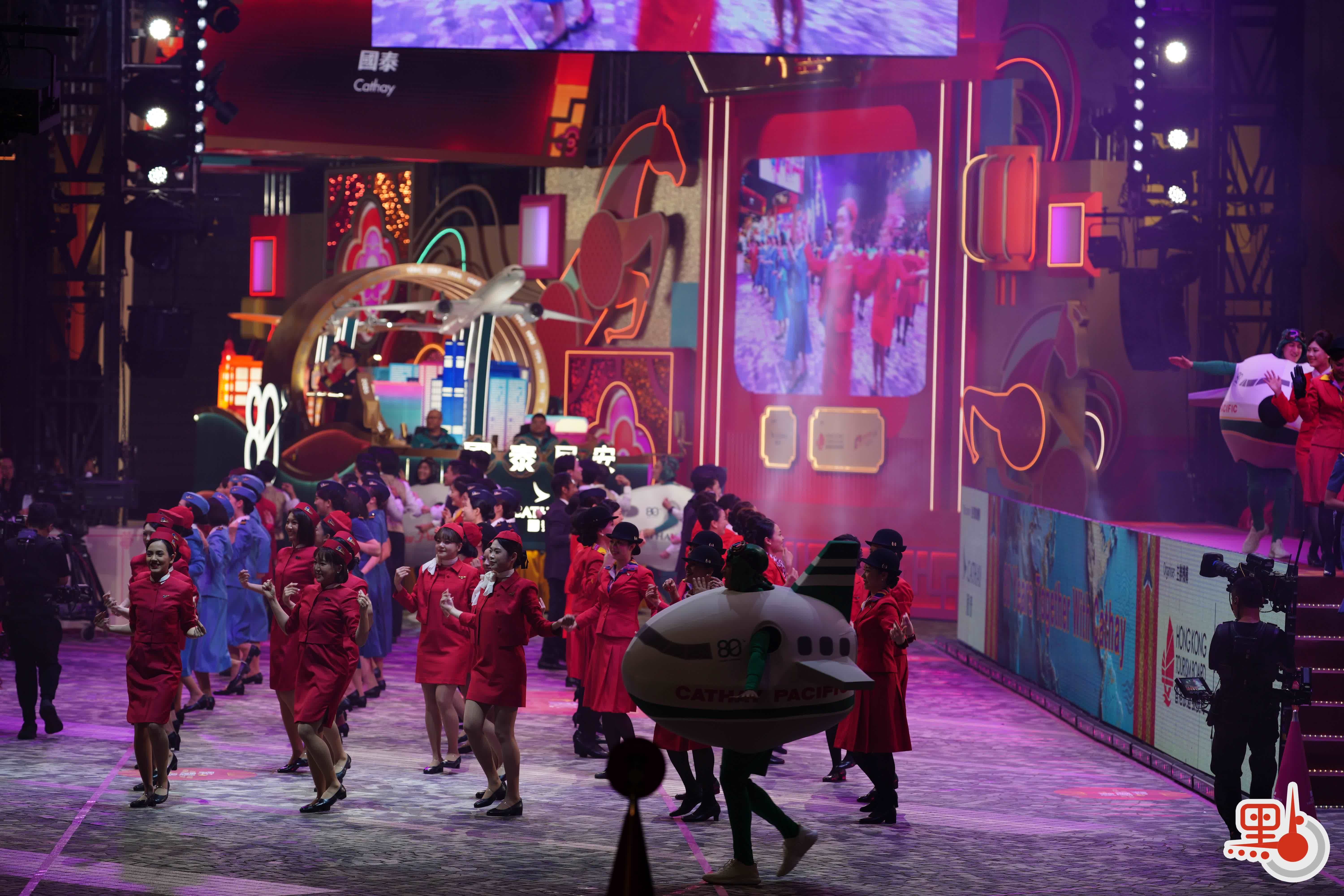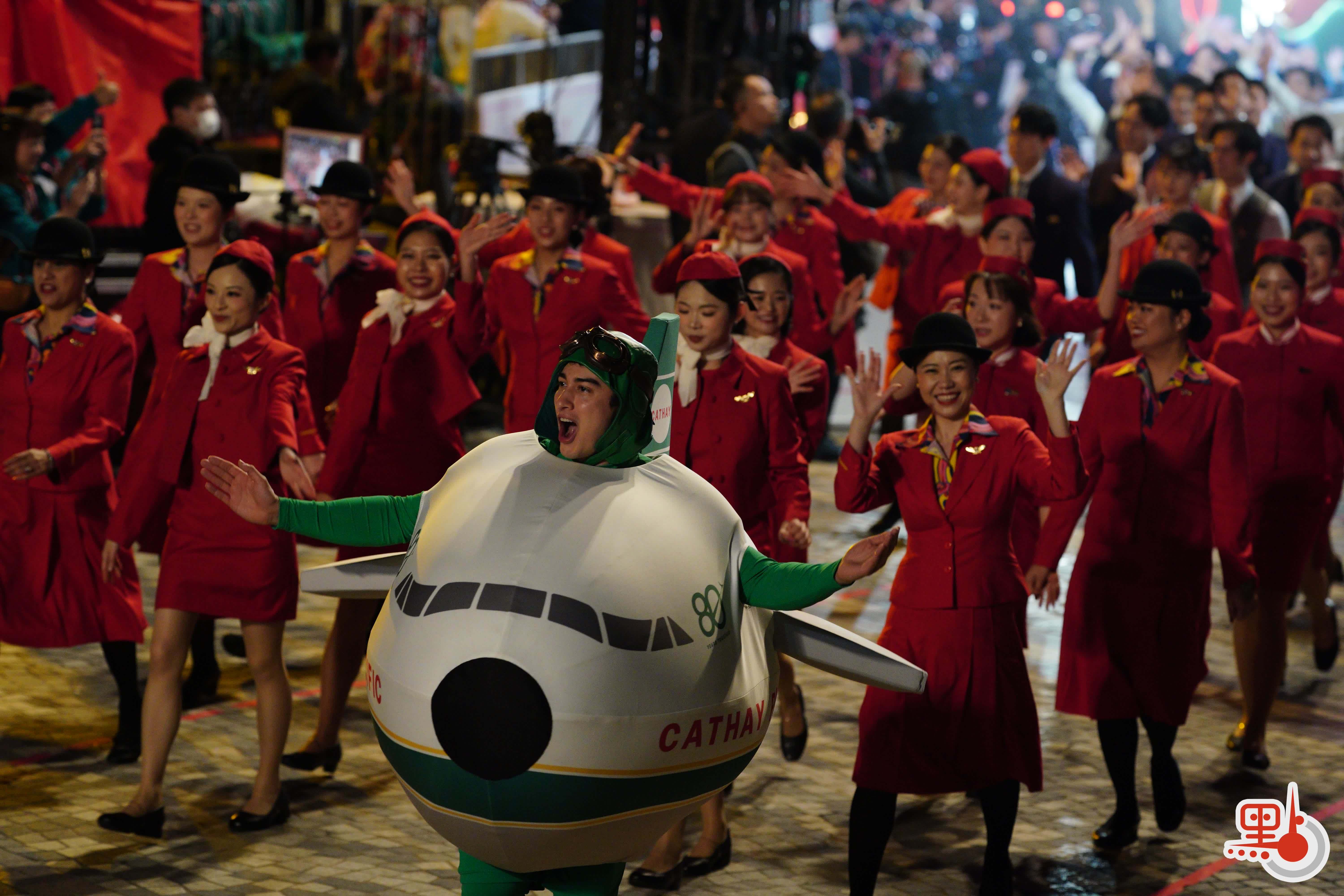 花车巡游昨晚(17日)8时在尖沙咀隆重登场,80位国泰机组和地勤人员组成的巡游团队身着不同时期空中制服,在音乐串烧下大跳劲舞。随后,“国泰同心飞跃八十年”主题花车率先出发,花车上有“80 YEARS TOGETHER”文字,外形设计则包涵了大量国泰经典元素,其两款客机在“时空隧道”下穿越时光,寓意国泰与香港共同走过的80年旅程。