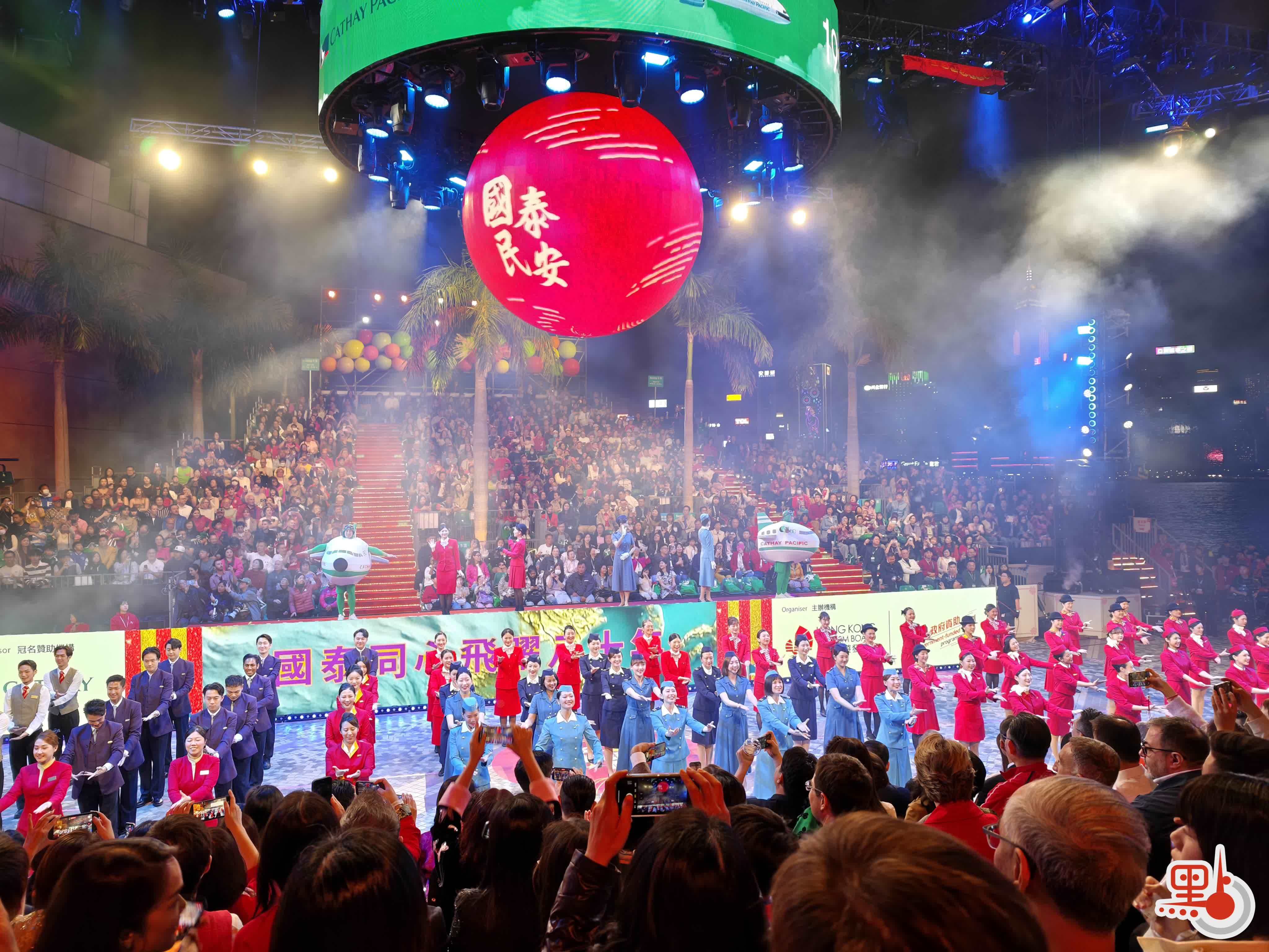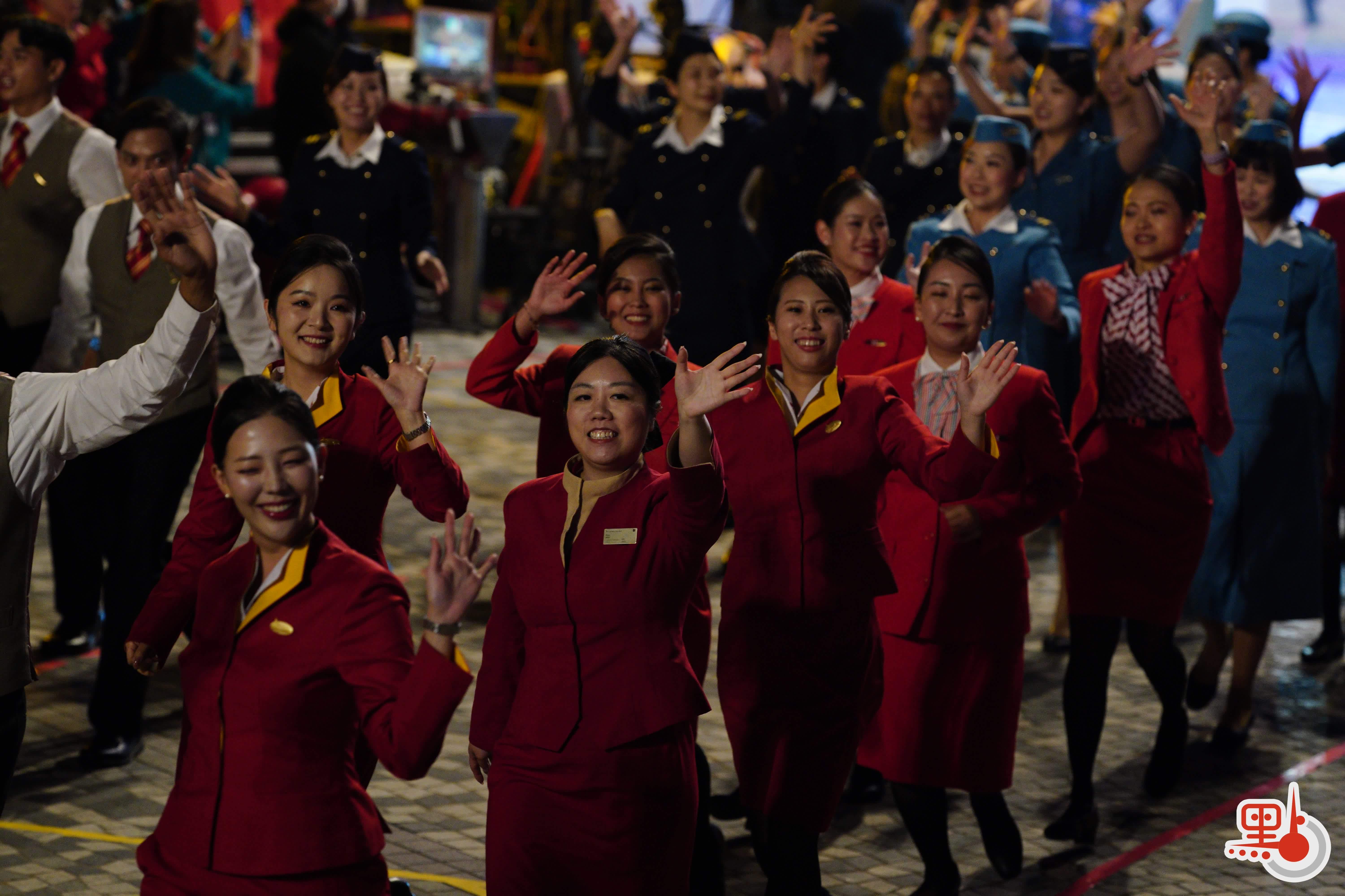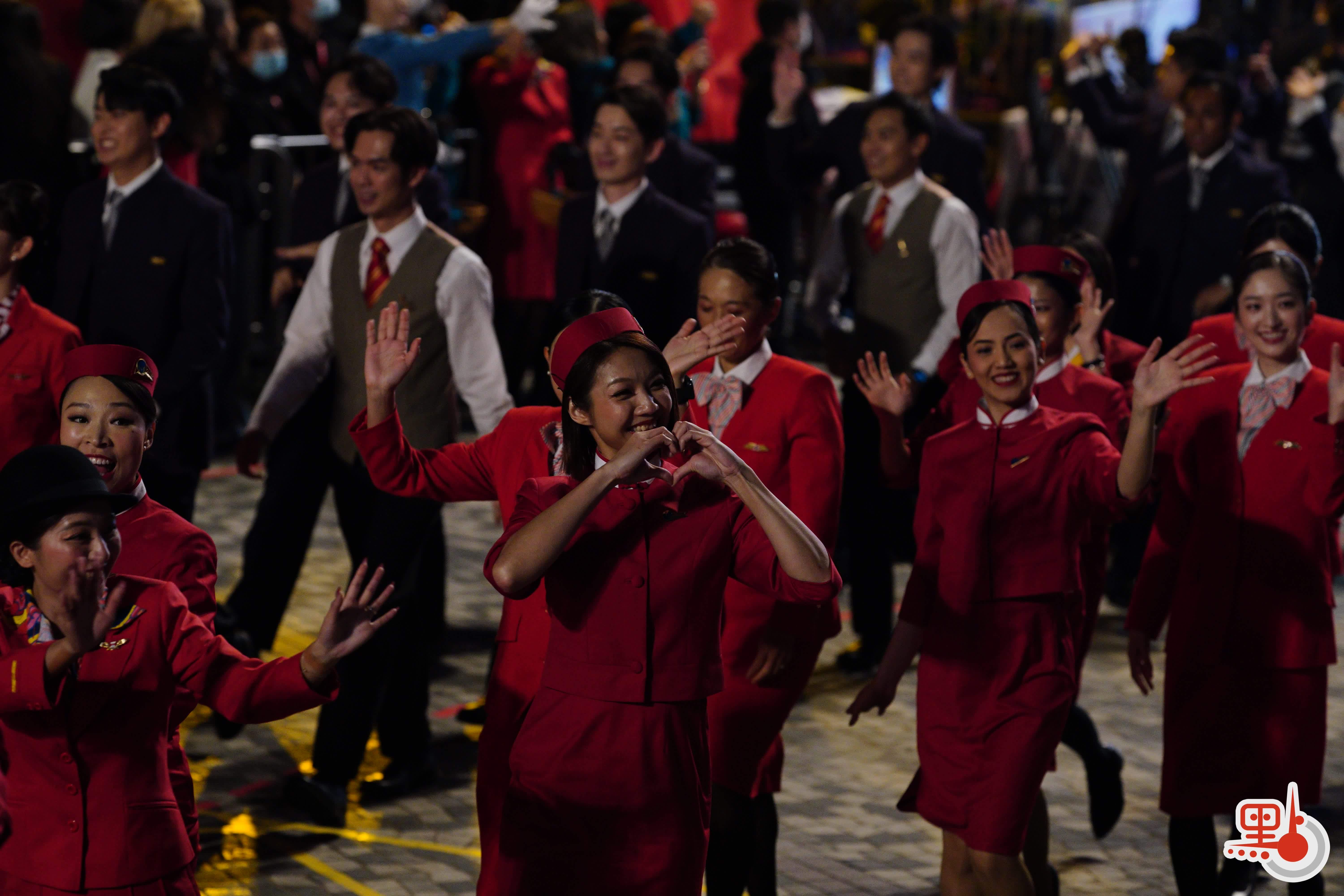 国泰机组和地勤人员组成的巡游团队大跳劲舞。