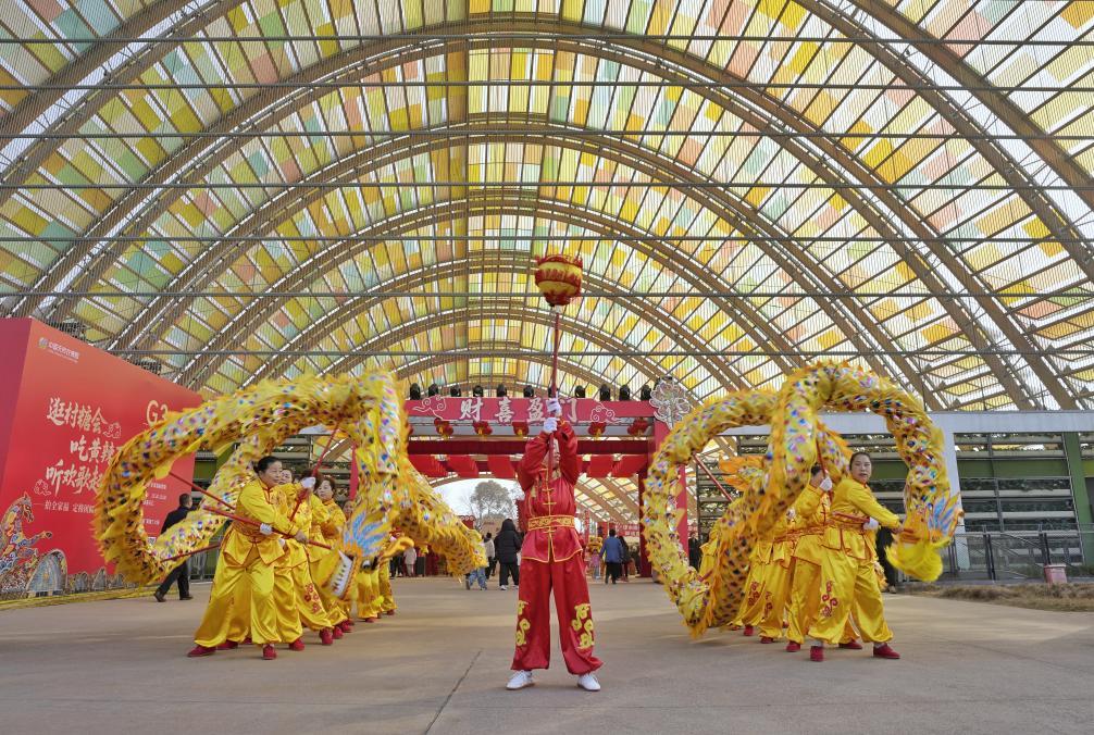 在成都新津区“村糖会”现场,当地龙灯队在表演。新华社记者 刘坤 摄