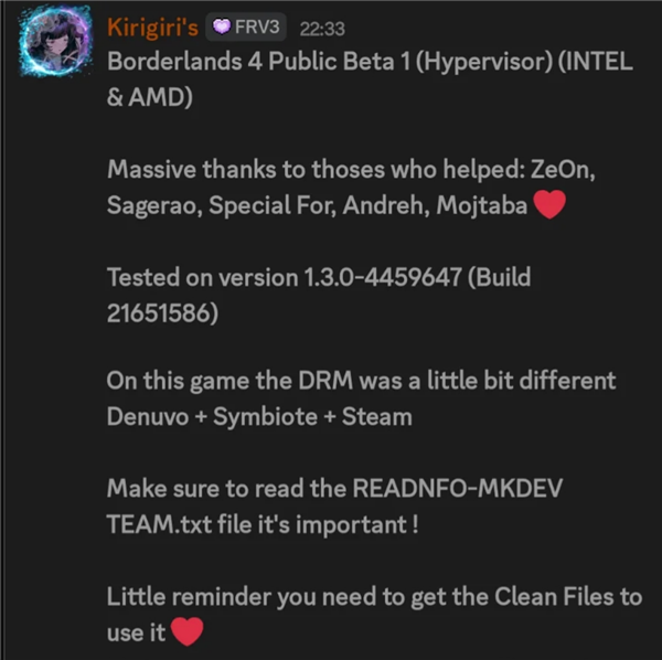 真正让业内震惊的是发售不满一年的《无主之地 4》也告沦陷。黑客 Kirigiri 利用 Hypervisor 不仅绕过了 Denuvo,还顺手解决了 2K 自家的 Symbiote DRM 和 Steam 保护,完成了“三重防线”的史诗级突防。