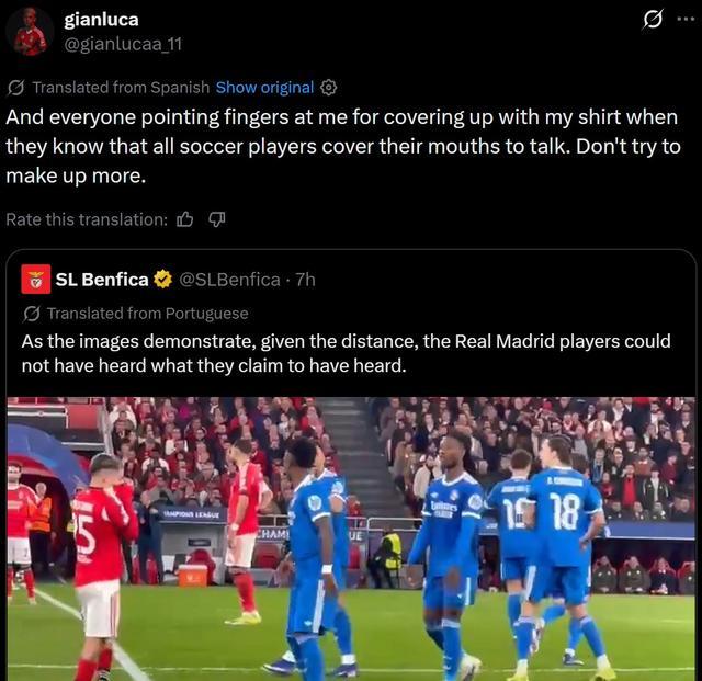 普雷斯蒂安尼的行为引起轩然大波,本菲卡官方在社交媒体发布了一段比赛切片视频,并表示皇马球员不可能听到他们认为的本菲卡球员说的内容。