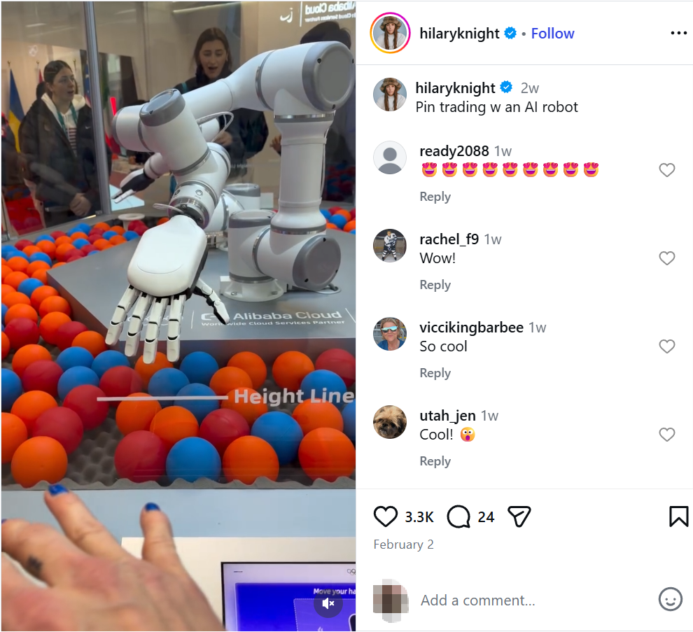 美国女子冰球运动员 Hilary Knight 与 AI 机械臂的互动视频,在社交媒体引发点赞热潮。