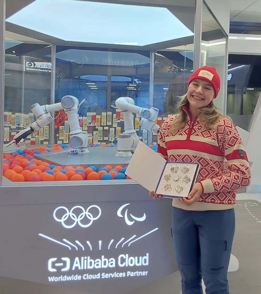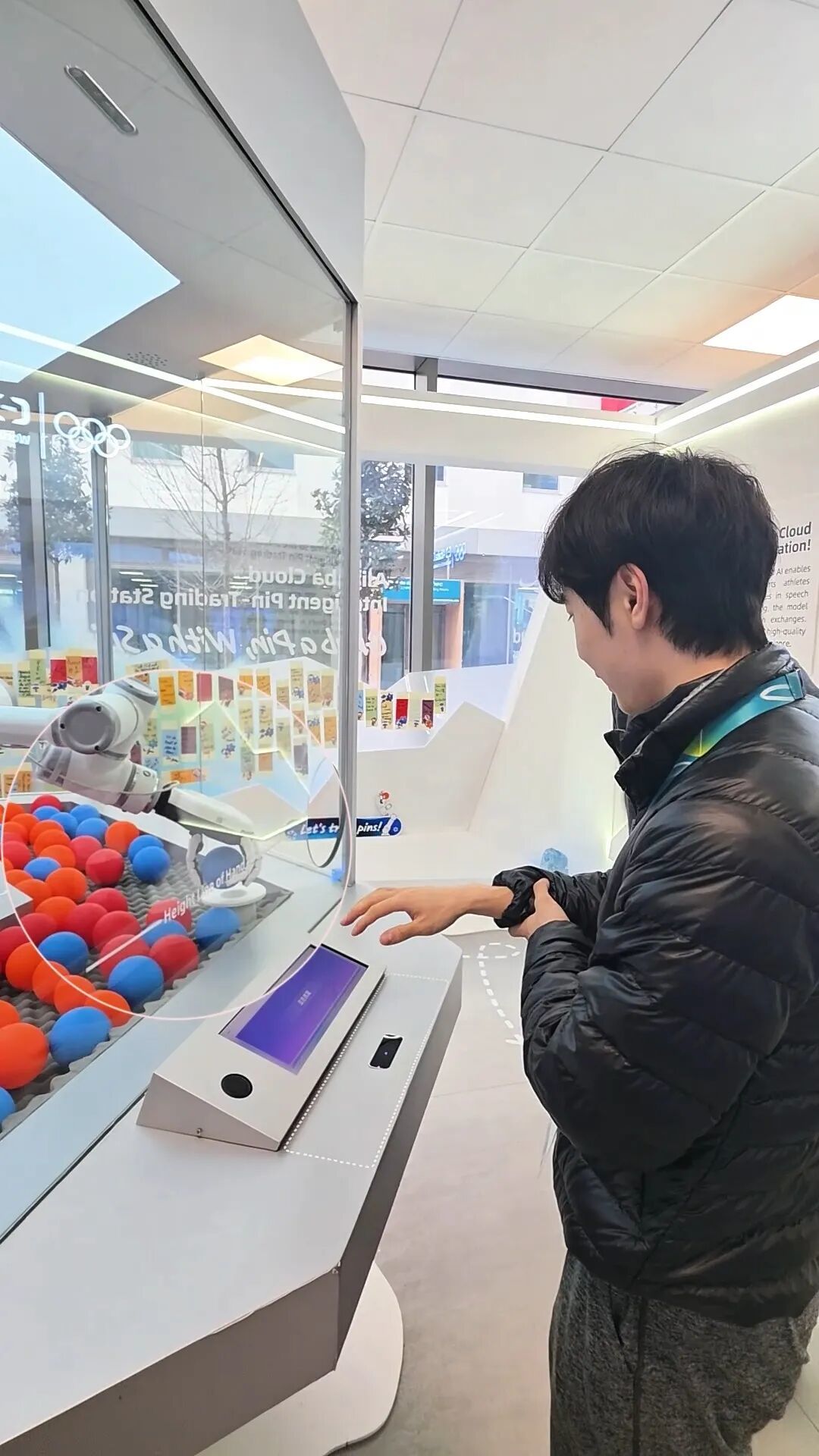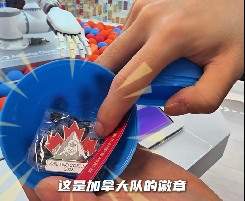 「帮我抓一个蓝色的。」法国冰球运动员 Anae Simon 用法语说道。很快,机械臂精准挑出一枚蓝色徽章球。拧开的瞬间,她的表情肉眼可见地亮了起来。