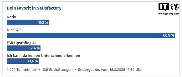 DLSS 4.5 在多数游戏中获胜,在《幸福工厂》(satisfactory)中,Nvidia 的优势最为明显,获得了 60.9% 的选票;在《地平线:西之绝境》中也拿到了 56.3% 的高支持率。