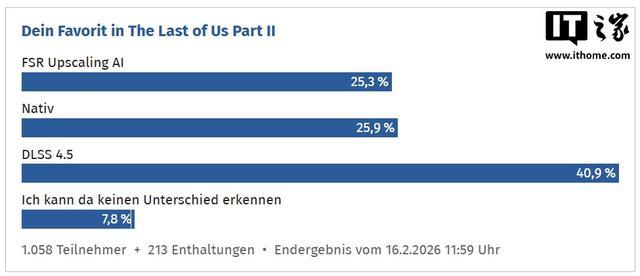 FSR 表现最接近的一次是在《最后生还者 Part II》中,获得了 25.3% 的选票,但仍略低于原生渲染的 25.9%。