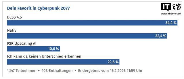 即便是在竞争最激烈的《赛博朋克 2077》中,DLSS 4.5 依然以 34.4% 的得票率险胜原生渲染(32.4% 选票)。