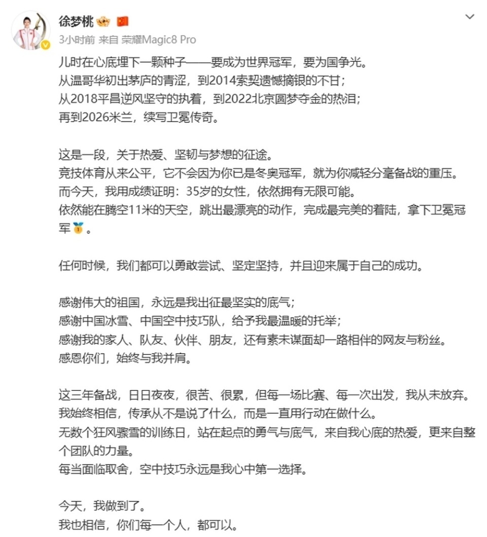 2月19日,徐梦桃在微博发长文,回顾心路历程: