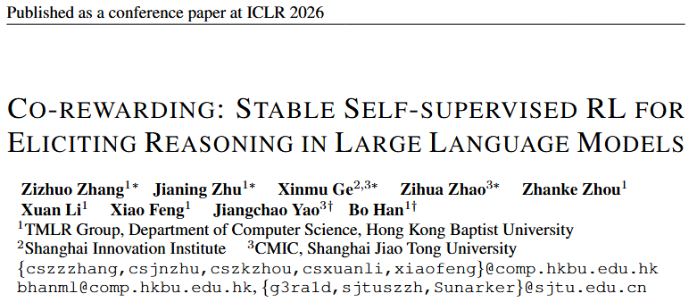 针对这一挑战,来自香港浸会大学和上海交通大学的可信机器学习和推理组提出了一个全新的自监督 RL 框架 ——Co-rewarding。该框架通过在数据端或模型端引入互补视角的自监督信号,稳定奖励获取,提升 RL 过程中模型奖励投机的难度,从而有效避免 RL 训练崩溃,实现稳定训练和模型推理能力的诱导。