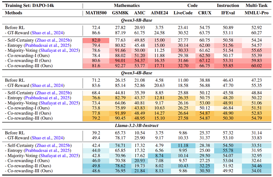 表 2:在 DAPO-14K 训练集上的性能对比,颜色越深表示相同组内性能越好。Co-rewarding-II 相比于最好的自我奖励基线方法在 4 个数学相关的基准上的平均提升达到 + 12.90%
