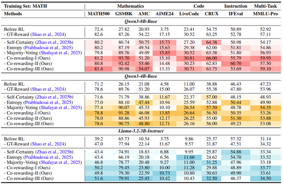 表 1:在 MATH 训练集上的性能对比,颜色越深表示相同组内性能越好。Co-rewarding-I 相比于最好的自我奖励的基线方法在 4 个数学相关的基准上的平均性能提升达到 + 4.42%