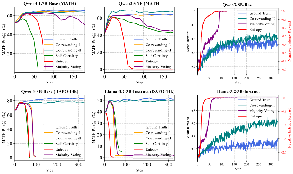 无论是哪一类方法,它们都是让当前模型从单一视角产生信号监督自己。这极易让模型进行奖励投机,以一种最容易方式拿到奖励,而不是产生正确的推理路径。这就像让学生自己监督自己学习时,学生会自己 “开小差” 一样。如图 1 所示,模型会发现重复输出部分 token 可以使得熵最小;模型输出一个一致但错误的答案,也可以拿到奖励。这就模型在 RL 的自我奖励机制中以投机的方式获取到最高奖励,奖励获取与推理正确性逐步脱钩,进而导致训练崩溃。