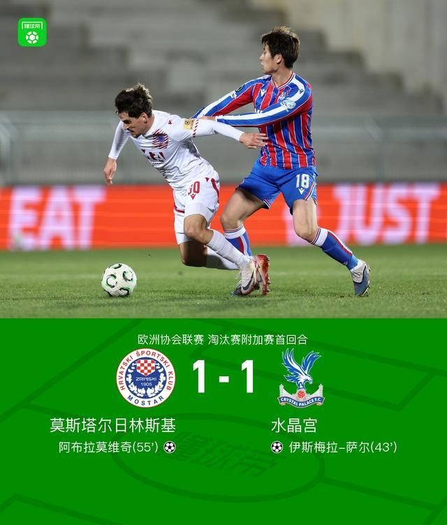 北京时间2月20日欧洲协会联赛 淘汰赛附加赛首回合,莫斯塔尔日林斯基对阵水晶宫。上半场,拉森做球,萨尔低射破门。下半场,米基奇助攻,阿布拉莫维奇扳平比分。全场比赛结束,水晶宫1-1战平莫斯塔尔日林斯基。