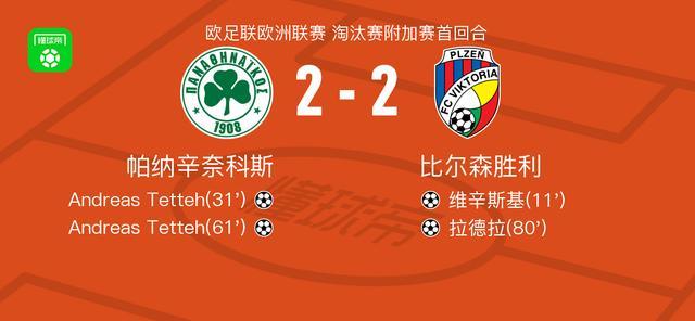 北京时间2月20日欧足联欧洲联赛 淘汰赛附加赛首回合,帕纳辛奈科斯对阵比尔森胜利。帕纳辛奈科斯Andreas Tetteh梅开二度。比尔森胜利维辛斯基破门,拉德拉破门。最终比分帕纳辛奈科斯 2-2 比尔森胜利。