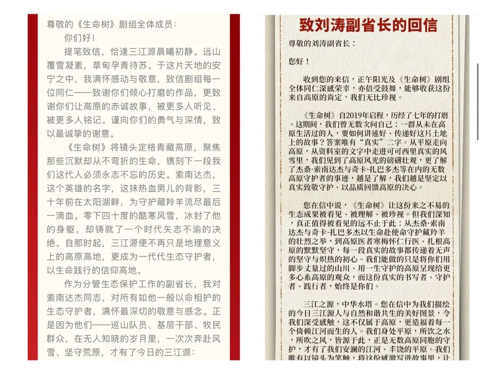 第二天,剧组回信:“生命之树,荫及四海。谨以此剧,祈愿《生命树》常青、三江源安好、每一位守护者平安归来。”