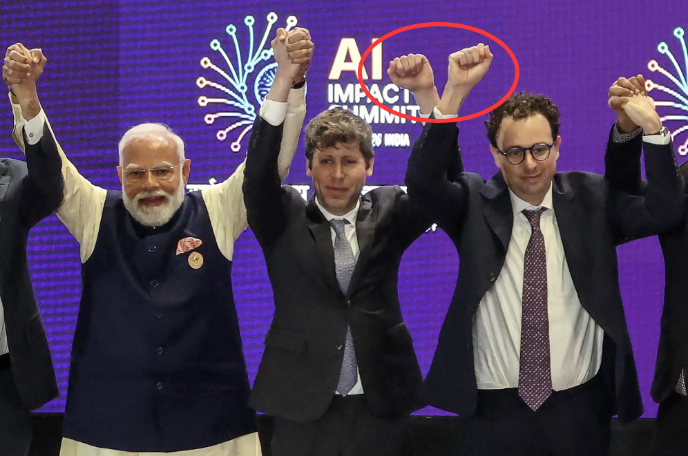 值得一提的是,在此次峰会上展现全球科技创新企业的共同承诺时刻,却变得异常尴尬:当印度总理莫迪邀请发言人手牵手举起以示团结时,台上所有高管都照做了——除了OpenAI CEO山姆·奥尔特曼和 CEO 达里奥·阿莫迪(Dario Amodei), 他们只是各自举起了拳头。