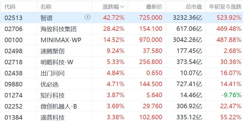 港股市场AI应用股集体飙升,截至收盘,智谱大涨42.72%,股价最高报725港元,总市值突破3200亿港元;MINIMAX-WP收涨14.52%,市值同样突破3000亿港元;海致科技集团收涨超28%,创上市新高。