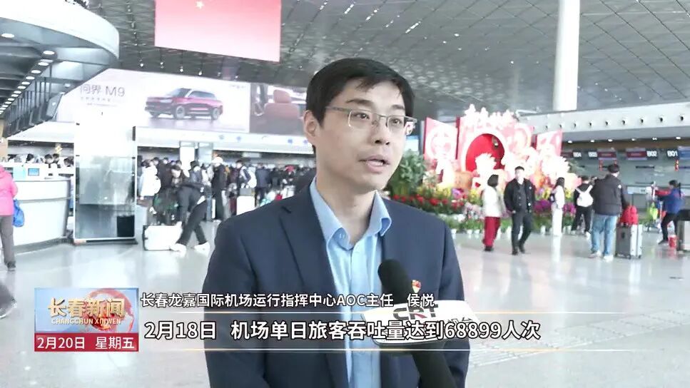长春龙嘉国际机场运行指挥中心AOC主任 侯悦:2月18日,机场单日旅客吞吐量达68899人次,刷新历史纪录,彰显着长春机场综合保障能力、航线网络韧性与区域航空枢纽地位再上新台阶。