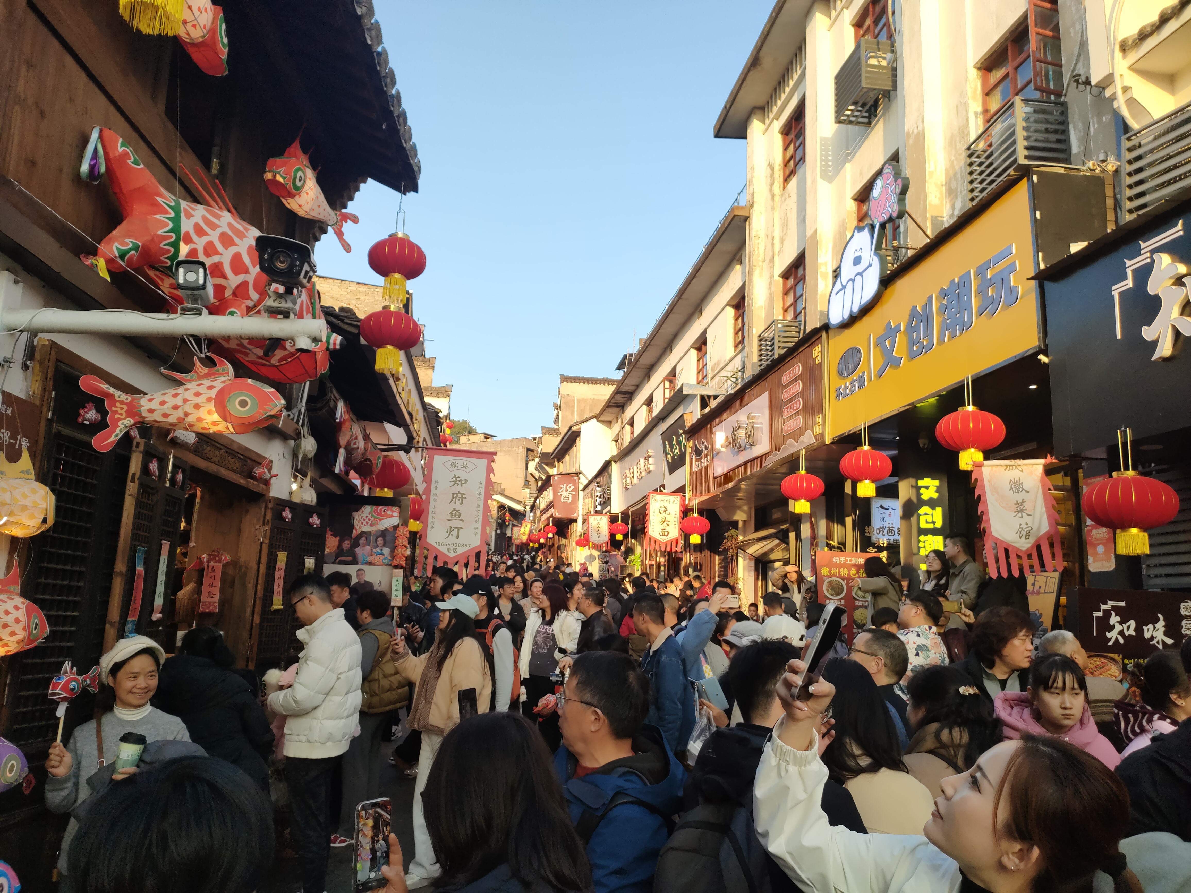 当天晚上6点半,歙县徽州古城鱼灯展演现场挤满了游客,造型各异的鱼灯令人目不暇接,现场更是挤得水泄不通,重复上演“人从众”名场面。