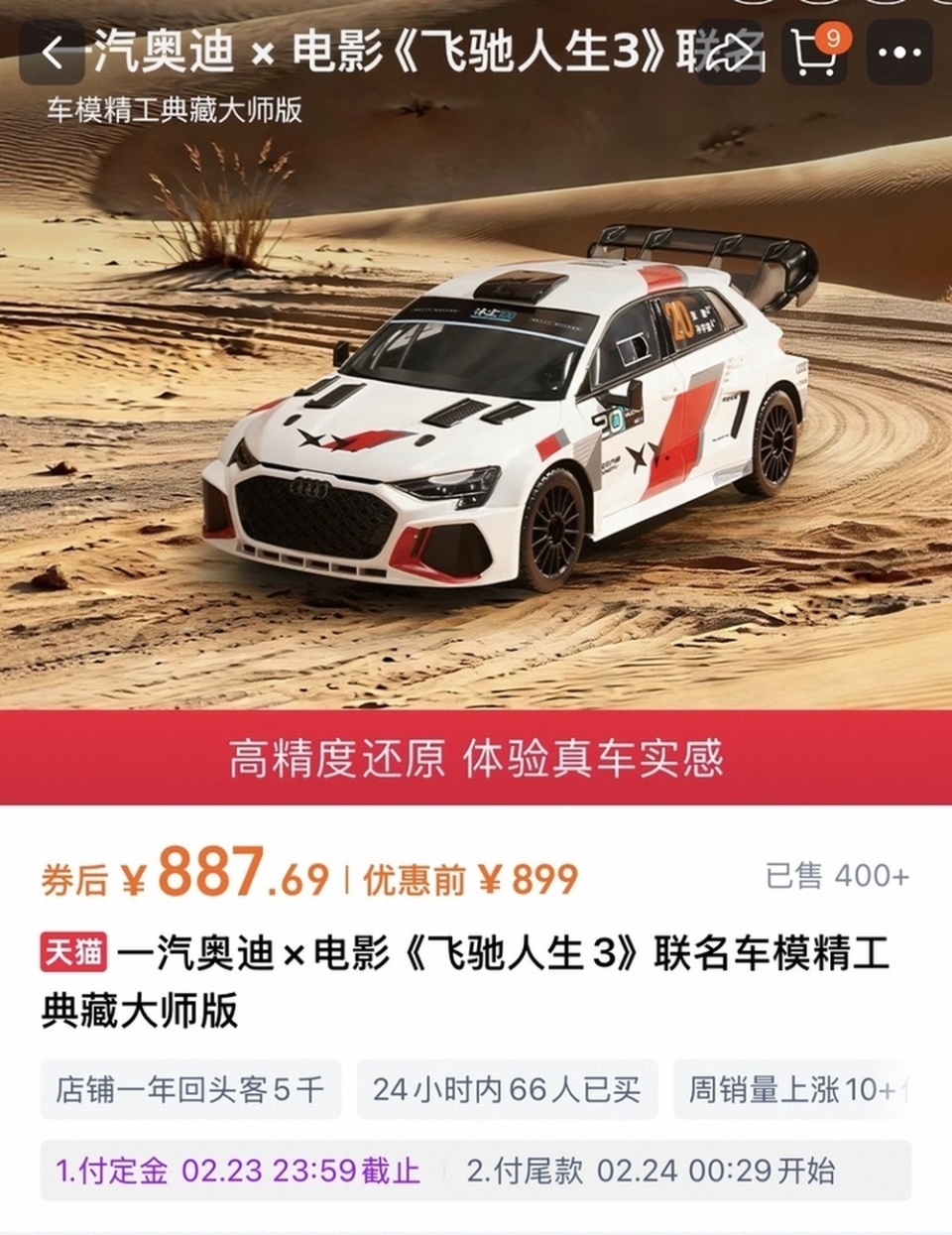 车企扎堆《飞驰人生3》,看中的不仅是票房数字,而是电影作为沉浸式体验媒介对消费决策的深层影响。数据显示,影片上映至今,官方授权售价129.9元的“拓意1:64奥迪A3拉力赛车模型”热销超2000单,24小时内超600人购买。售价109元的“一汽奥迪×电影《飞驰人生3》联名车模掌上飞驰纪念版”已售出超1000单。售价高达899元的“一汽奥迪×电影《飞驰人生3》联名车模精工典藏大师版”也卖出400余单。在电商平台搜索“飞驰人生3同款”、奥迪A3拉力赛车,近期都迎来销量激增。