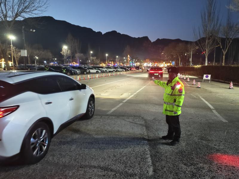 夜幕降临,龙庆峡冰灯展的灯光璀璨夺目,特色主题冰雕在夜色中更显灵动,景区周边的车流依旧络绎不绝,民警们的值守却从未停歇。