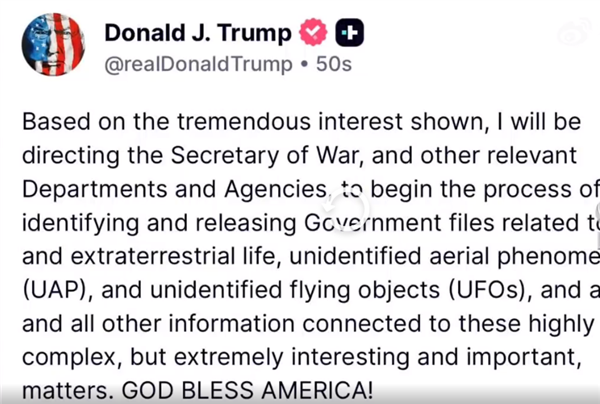美国总统特朗普在社交媒体发帖称,鉴于公众“表现出巨大兴趣”,他将指示战争部长(国防部长)赫格塞思及相关部门与机构,着手启动识别并公开与外星人、地外生命、不明空中现象(UAP)以及不明飞行物(UFO)相关的政府文件。