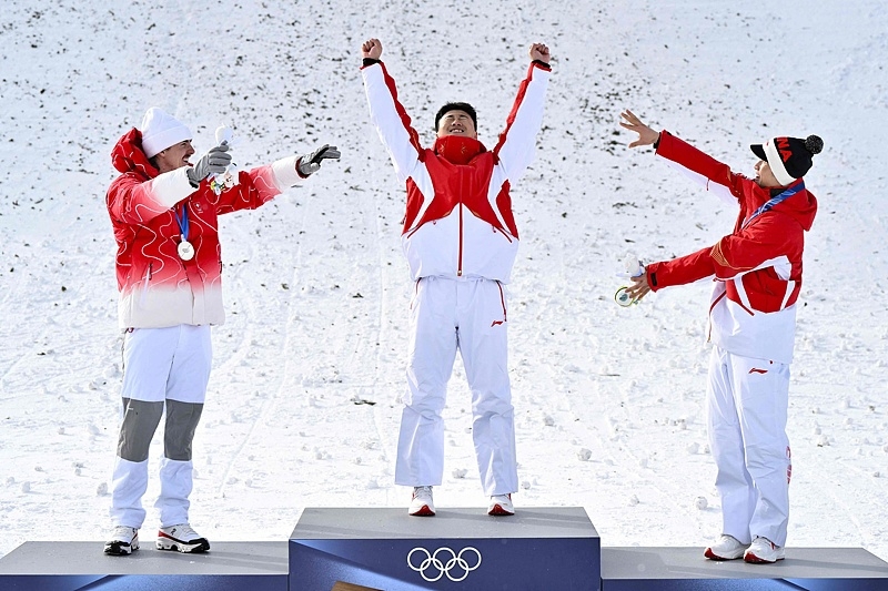 亚军罗特和季军李天马,一起夸张地招呼着王心迪登台。他睁开眼,轻轻一跃,做出一个空中技巧落地时的标志性动作——这和两天前徐梦桃的登台动作一模一样——又一对奥运冠军夫妻,稳稳地落地了。