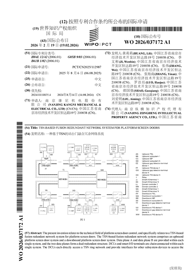 证券之星消息,根据企查查数据显示康尼机电(603111)公布了一项国际专利申请,专利名为“一种基于TSN的站台门融合冗余网络系统”,专利申请号为PCT/CN2025/112987,国际公布日为2026年2月19日。