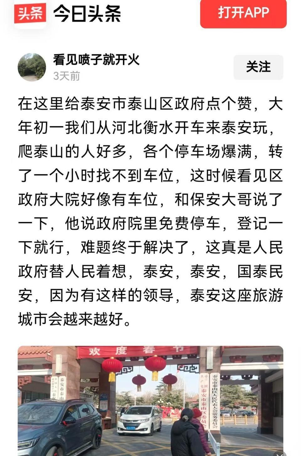 春节假期,泰山区机关事业单位停车场免费开放的暖心举措收获满满好评,河北衡水一位游客在社交平台分享泰山区政府大院免费停车的经历,引发网友广泛共鸣,成为泰山脚下新春服务的一抹温暖亮色。