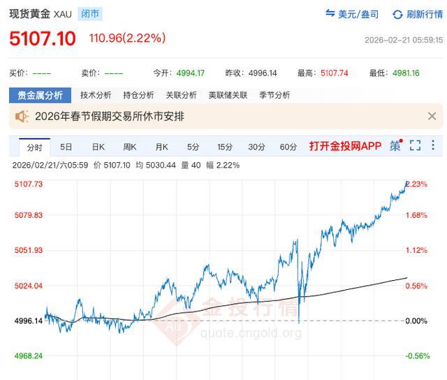 从北京时间2月21日凌晨开始,伦敦金属交易所现货黄金价格持续走高,在闭市前重回5100美元/盎司,最终闭市价格为5107.1美元/盎司。这是1月30日金价大跌以来首次重回5100美元/盎司。