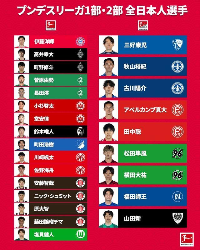 北京时间2月21日,德甲日本官方账号统计了德甲德乙的全部日本球员,共计25人。