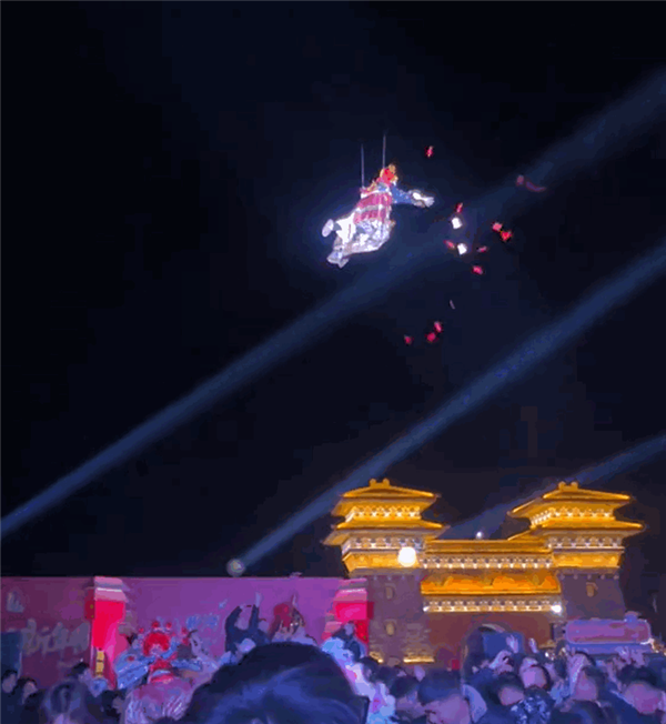 视频中,一位女演员使用威亚飞在半空中,期间不断抛洒现金红包,活动现场有不少游客在地上捡钱,场面热闹异常。