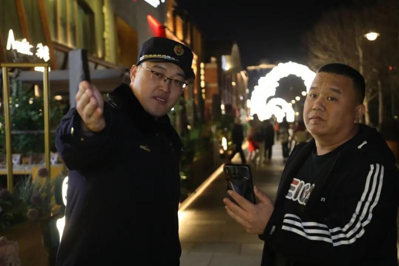 大年初三灯光秀如期而至,副队长刘元豪、边帅从当日下午就来到蓝色港湾北边的亮马河食街,沿着河岸先走一趟。距离用餐高峰还有一段时间,亮马河南岸有的商户门口还堆积着新春年货,刘元豪等人赶紧和店员们一起帮忙整理。看到刚开业不久的店,刘元豪提醒门口的店员燃气安全别大意,泄漏报警器得一直开着,有情况随时联系队里。
