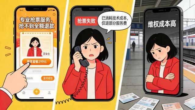 王女士急着买票,在某平台看到“专业抢票服务,抢不到全额退款”的广告,花了299元买了“尊享套餐”。而后王女士自行通过官方渠道抢到车票,但该代抢平台却无视实际情况,以 “购票成功” 为借口擅自二次扣费。王女士第一时间联系客服维权,历经半个月、投入大量时间精力,才最终追回费用。