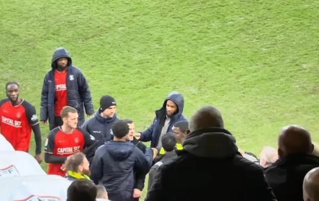 卢顿主帅杰克-威尔希尔在球队1-1战平伯顿的比赛结束后,因现场混乱冲突被工作人员强行拉离球迷区域。