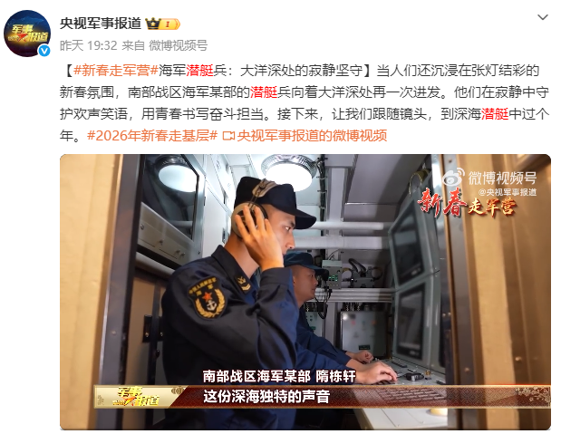 央视军事频道《新春走基层》系列报道近日聚焦海军潜艇兵:当人们还沉浸在张灯结彩的新春氛围,南部战区海军某部的潜艇兵向着大洋深处再一次进发。