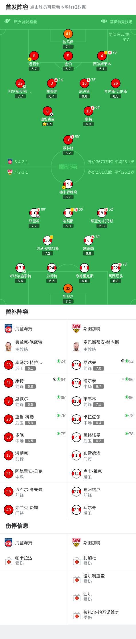 北京时间2月23日德国足球顶级联赛 联赛 第23轮,海登海姆主场对阵斯图加特。海登海姆迪恩克吉破门,康特破门,阿尔扬-伊布拉希莫维奇破门。斯图加特菲里希破门,昂达夫破门,米特尔施泰特破门。最终比分海登海姆 3-3 斯图加特。