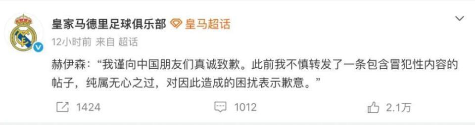 2月22日晚间,@皇家马德里足球俱乐部 微博发布了赫伊森的道歉内容。赫伊森说:“我谨向中国朋友们真诚致歉。此前我不慎转发了一条包含冒犯性内容的帖子,纯属无心之过,对因此造成的困扰表示歉意。”