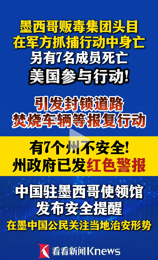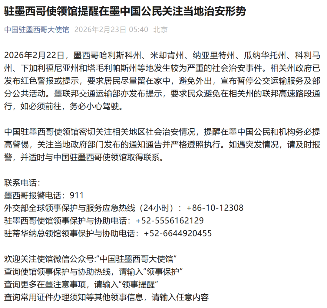 2月23日,“中国驻墨西哥大使馆”官微发布提醒:2026年2月22日,墨西哥哈利斯科州、米却肯州、纳亚里特州、瓜纳华托州、科利马州、下加利福尼亚州和塔毛利帕斯州等地发生较为严重的社会治安事件。相关州政府已发布红色警报或提示,要求居民尽量留在家中,避免外出,宣布暂停公交运输服务及部分公共活动。墨联邦交通运输部亦发布提示,要求民众避免在相关州的联邦高速路段通行,如必须前往,务必小心驾驶。