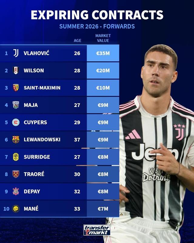 德国转会市场统计了今夏合同到期的十大前锋,其中球员按照身价从高到低排序。