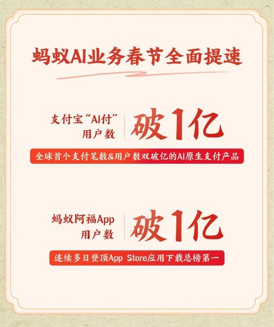 新浪科技讯 2月23日上午消息,马年大年初七,蚂蚁集团披露春节假期实战数据,核心AI业务全面爆发:支付宝“AI付”用户数突破1亿,蚂蚁阿福App的总用户数也突破1亿大关。