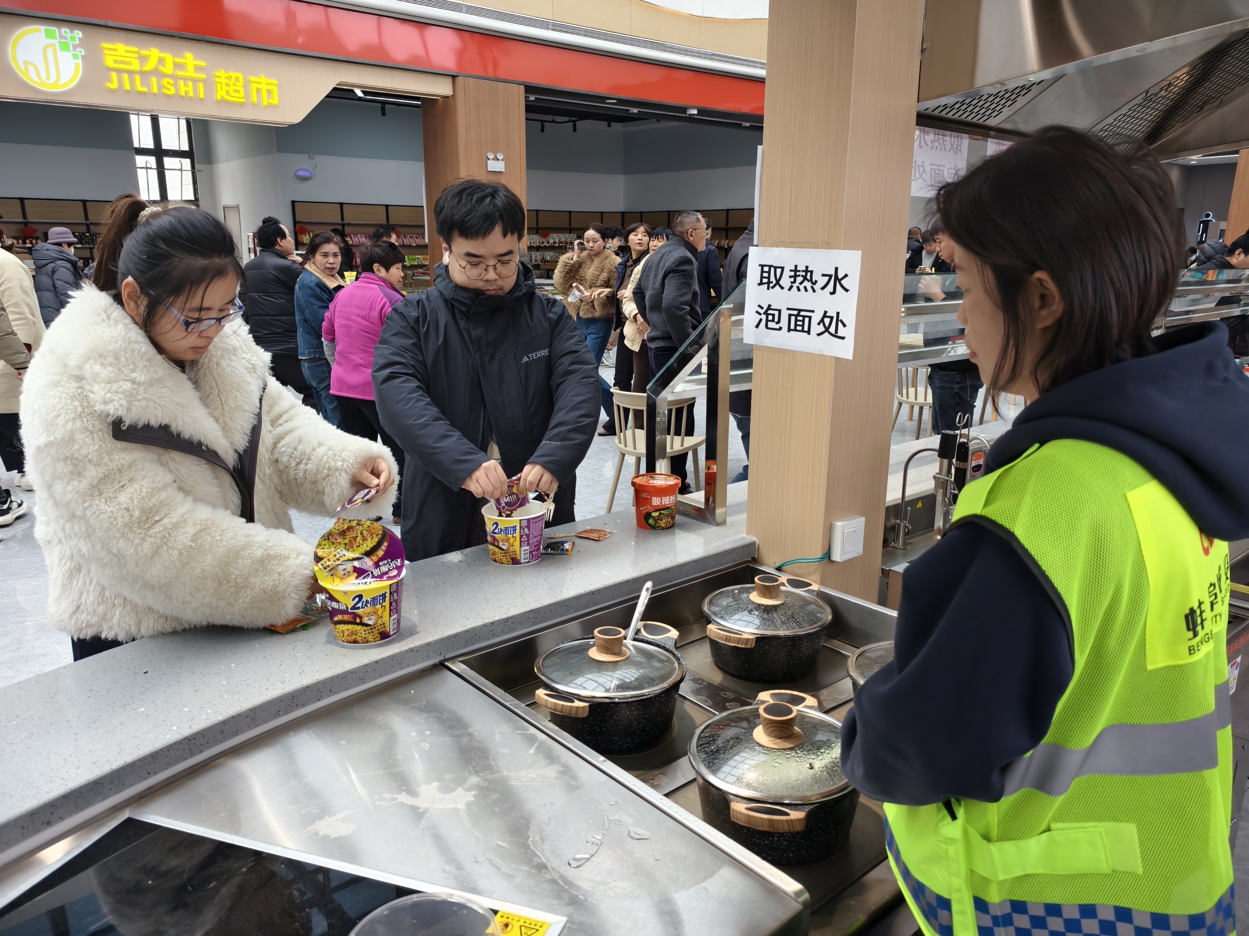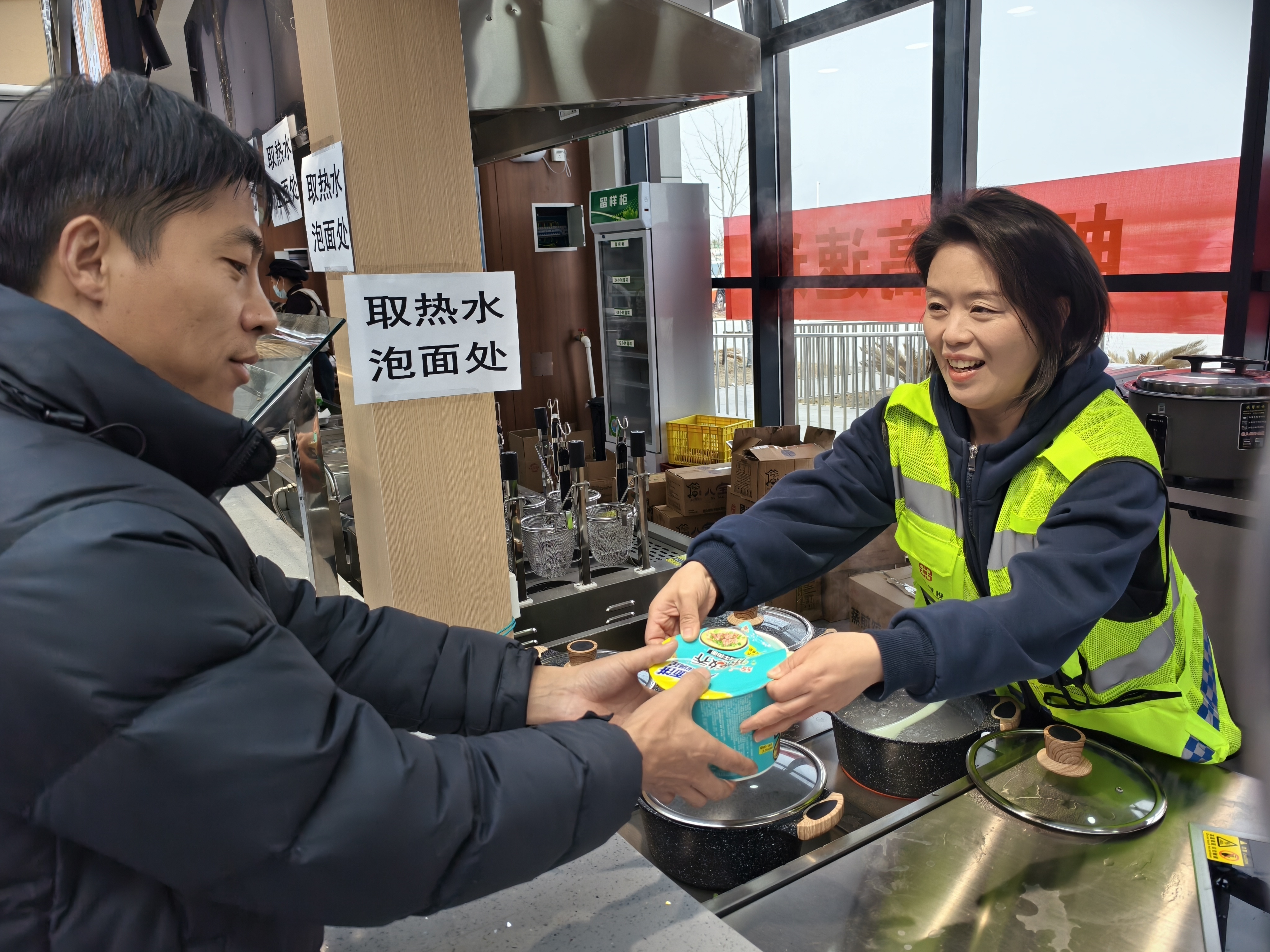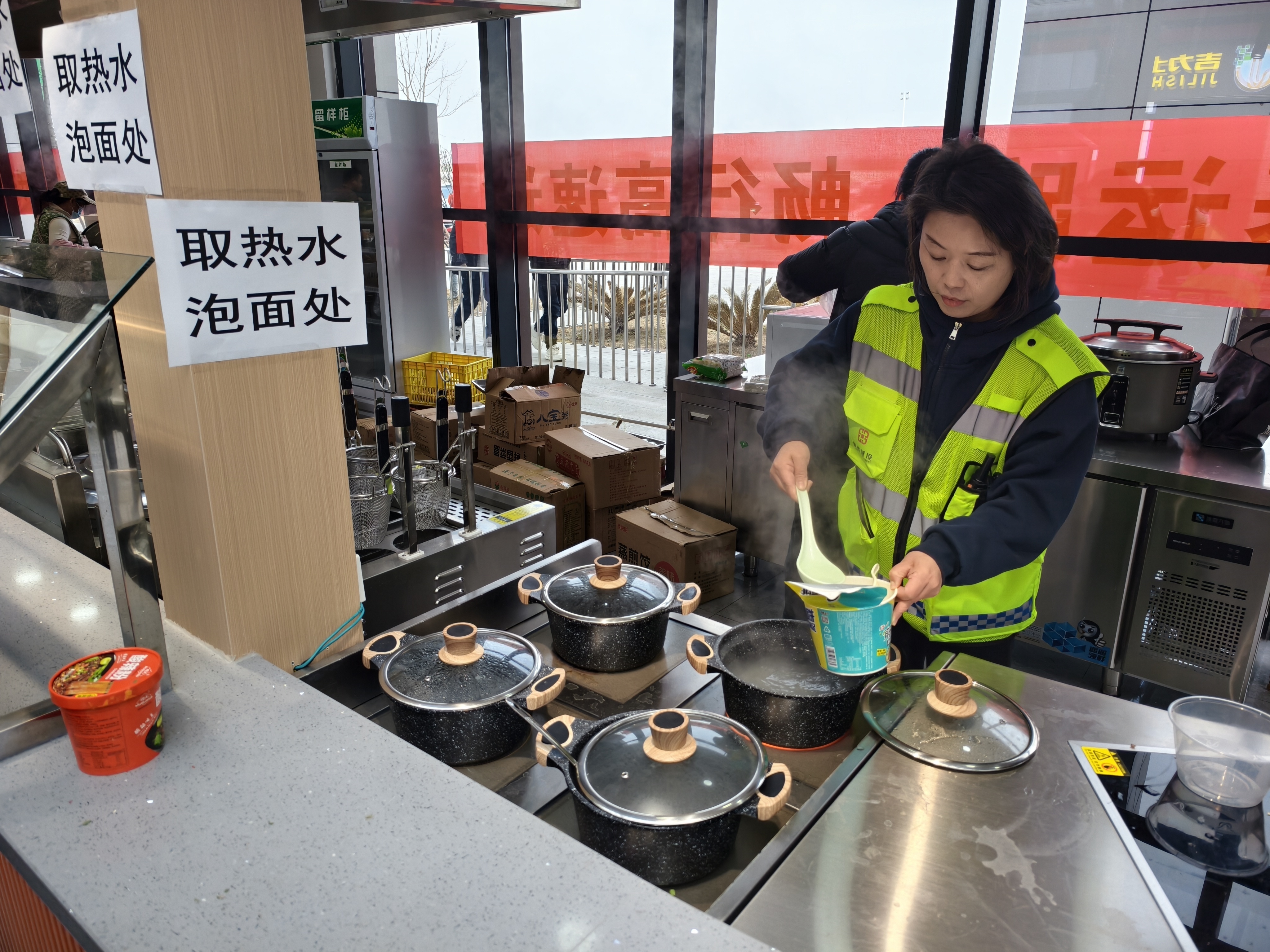 记者在现场看到,返程车流持续增多,服务区内饮水需求激增,常规供水设备难以满足。管理方快速响应、就地调配,把餐饮用电磁炉集中用于烧开水,专人值守保障供水不间断,有效缓解排队压力。不少旅客表示,春运路上一杯热水暖心暖胃,服务区灵活应变、贴心服务,让返程旅途更有温度。