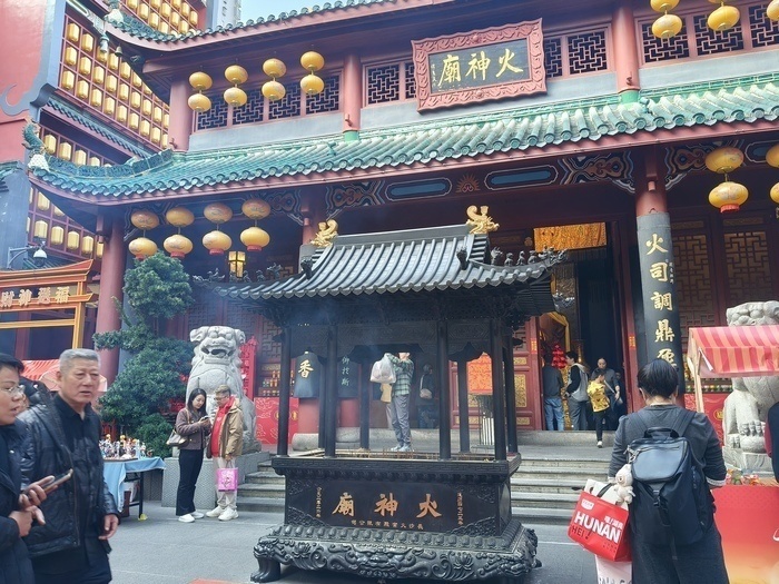再穿过一条流光溢彩、充斥各种中国元素的“烟火市集”,来到广场,左面即是雕梁画栋的火神庙。环视场内,人们很容易被四周热气腾腾的小吃摊吸引,有热辣咸香的湖南非遗特产臭豆腐、醇厚的芝麻豆子茶,油锅里滋滋响着的糖油粑粑、清甜的长乐甜酒……把湖南人的“爱吃”体现得淋漓尽致,外地的游客边吃边逛,甚至不用走到“小吃王国”,就能吃个半饱。