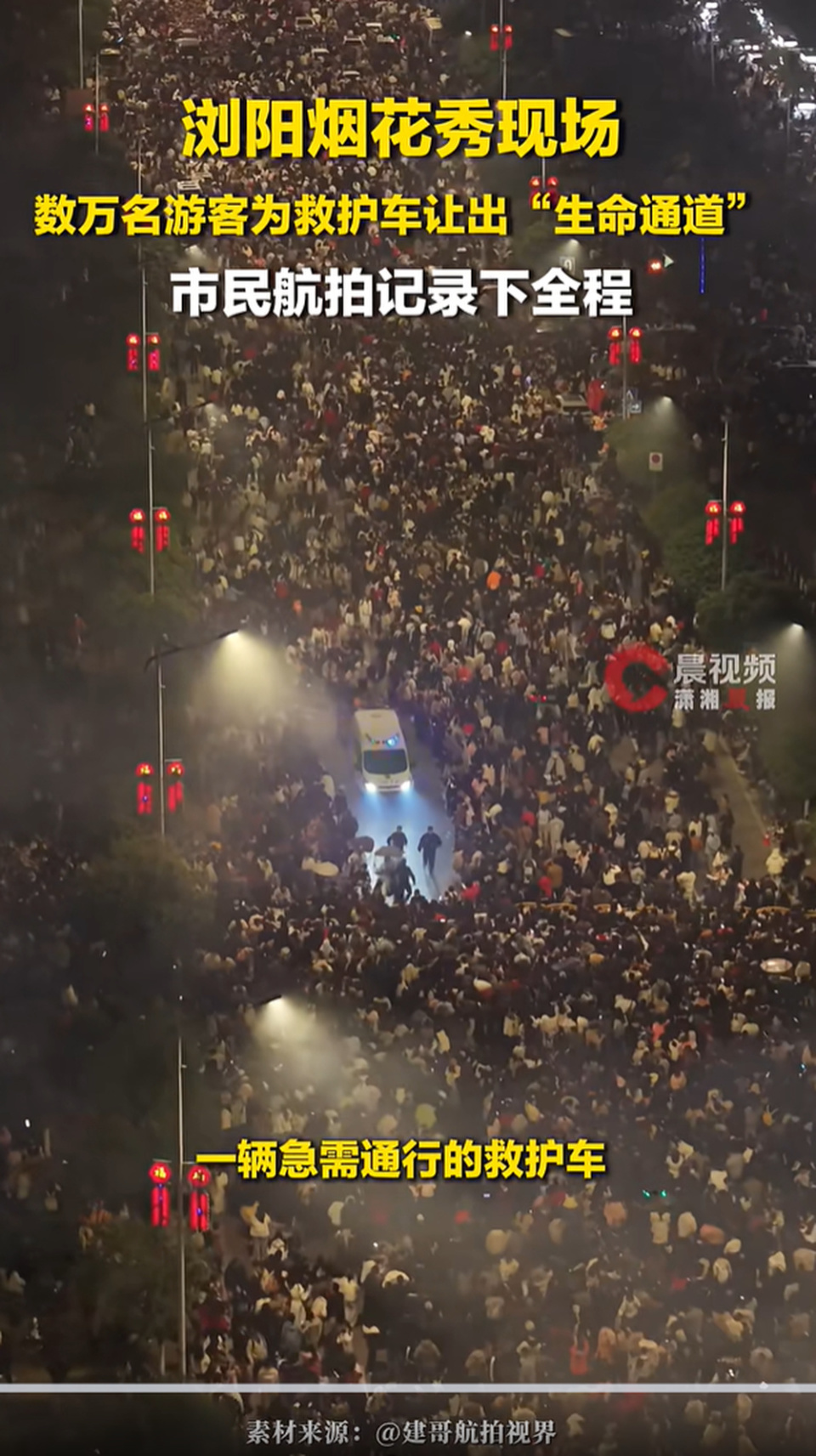 2月21日晚,浏阳举行2026马年新春焰火晚会,现场人山人海。据潇湘晨报报道,来自浙江的张先生在拍摄烟花表演时,用无人机拍下感人一幕,数万名游客为一辆救护车让出了一条“生命通道”。