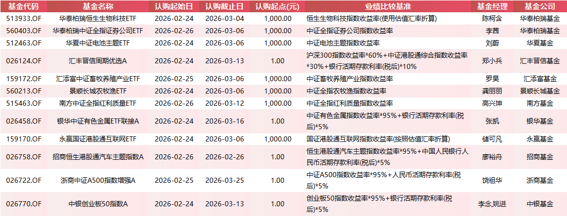 今日(2月24日)成为本周首发最密集的“周二档”。 当日共有7只基金启动认购,包括华泰柏瑞恒生生物科技ETF(513933.OF)、华夏中证电池主题ETF(512463.OF)、汇丰晋信周期优选(A:062124.OF C:026125.OF)、景顺长城农业ETF(560213.OF)、银华中证有色金属ETF联接(A:026458.OF C:026459.OF)、永赢国证港股通互联网ETF(159170.OF)、中银创业板50指数(A:026770.OF C:026771.OF)。其中,汇添富中证消费服务产业ETF(159172.OF) 于2月25日起发行,跟踪中证消费服务产业指数;浙商中证A500指数增强(A:026722.OF C:026723.OF) 同日发售,力争在跟踪中证A500指数基础上获取超额收益。华泰柏瑞中证全指证券公司ETF(560403.OF)、南方中证全指红利质量ETF(515463.OF)、招商恒生港股通汽车主题指数(A:026758.OF C:026759.OF)于2月26日同日上架。值得一提的是,招商恒生港股通汽车主题指数仅发行一天,认购截止日即为发行起始日。