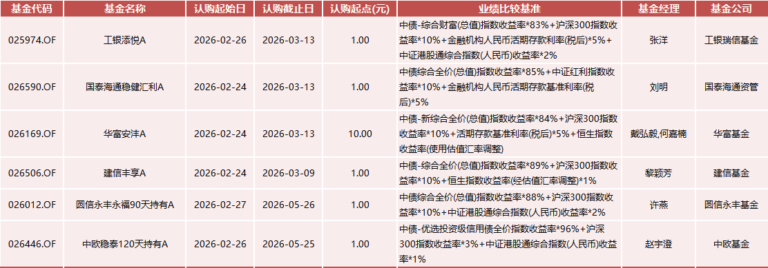 今日3只产品集中上架。 包括国泰海通稳健红利(A:026590.OF C:026591.OF)、华富安泽(A:026169.OF C:026170.OF)、建信丰享(A:026506.OF C:026507.OF)。其中,国泰海通稳健红利基准中债券占比85%,叠加中证红利指数10%,由国泰海通资管刘明管理;华富安泽认购起点为10元,由戴凯毅、何嘉楠共同掌舵;建信丰享债券仓位达89%,由建信基金固收老将黎颖芳挂帅。2月26日工银添悦(A:025974.OF C:025981.OF)、中欧稳泰120天持有(A:026446.OF C:026447.OF)同日发售。 工银添悦A由工银瑞信基金张洋管理,基准中债券仓位83%,叠加沪深300指数10%;中欧稳泰120天持有A由中欧基金赵宇澄管理,债券仓位高达96%,主要配置投资级信用债,认购期将延续至5月25日。国信永丰永福90天持有(A:026012.OF C:026013.OF)27日单独发行。 该产品由圆信永丰基金许燕管理,债券仓位88%,认购期长达3个月,至5月26日截止,为投资者提供了较长的布局窗口。