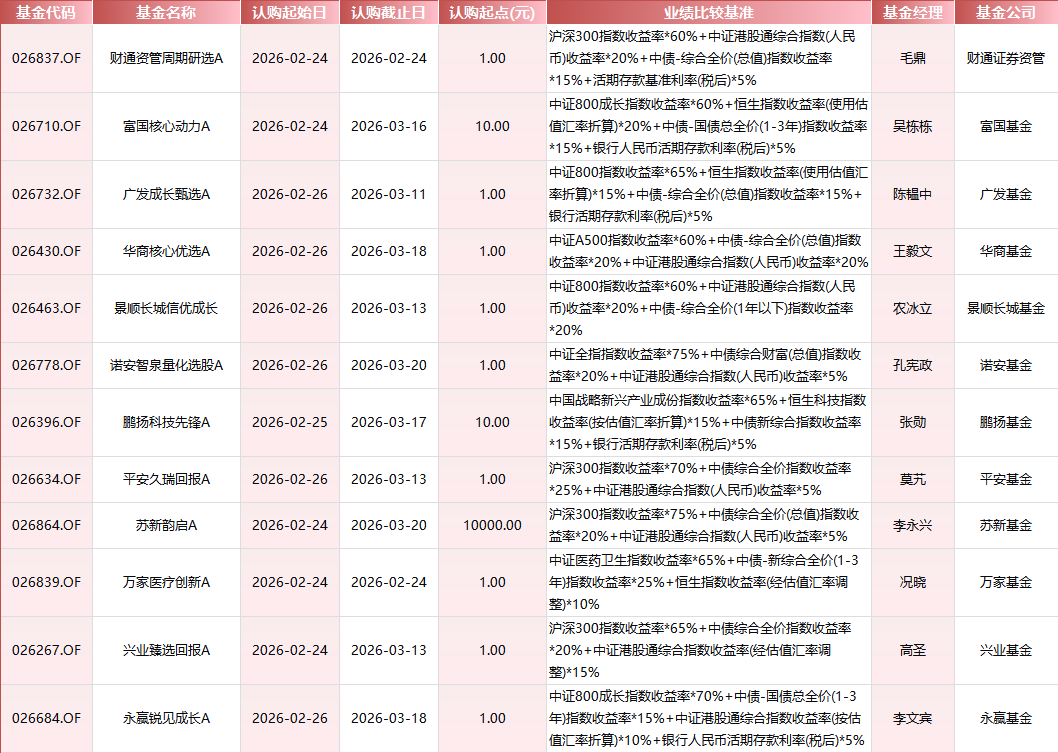 今日(2月24日)发行最为密集,当日6只产品集中上架。 包括财通资管周期研选(A:026837.OF C:026838.OF)、富国核心动力(A:026710.OF C:026711.OF)、苏新韵启(A:026864.OF C:026865.OF)、万家医疗创新(A:026839.OF C:026840.OF)、兴业臻选回报(A:026267.OF C:026268.OF)等。其中,万家医疗创新A以中证医药卫生指数为主要基准(65%),专注医药赛道机会;苏新韵启A认购起点为1万元,为本周门槛最高的产品,由资深基金经理李永兴管理。